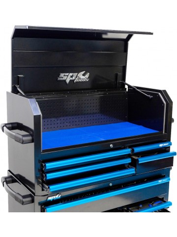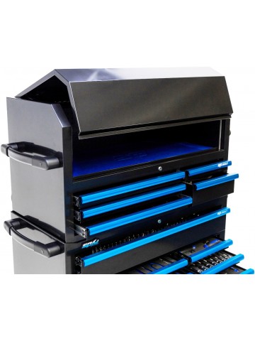 410 PC WERKZEUGKASTEN IN KUNDENSPEZIFISCHER SERIE ROLLWAGEN 14 SCHUBLADEN SCHWARZ/BLAU OBERTEILBOX