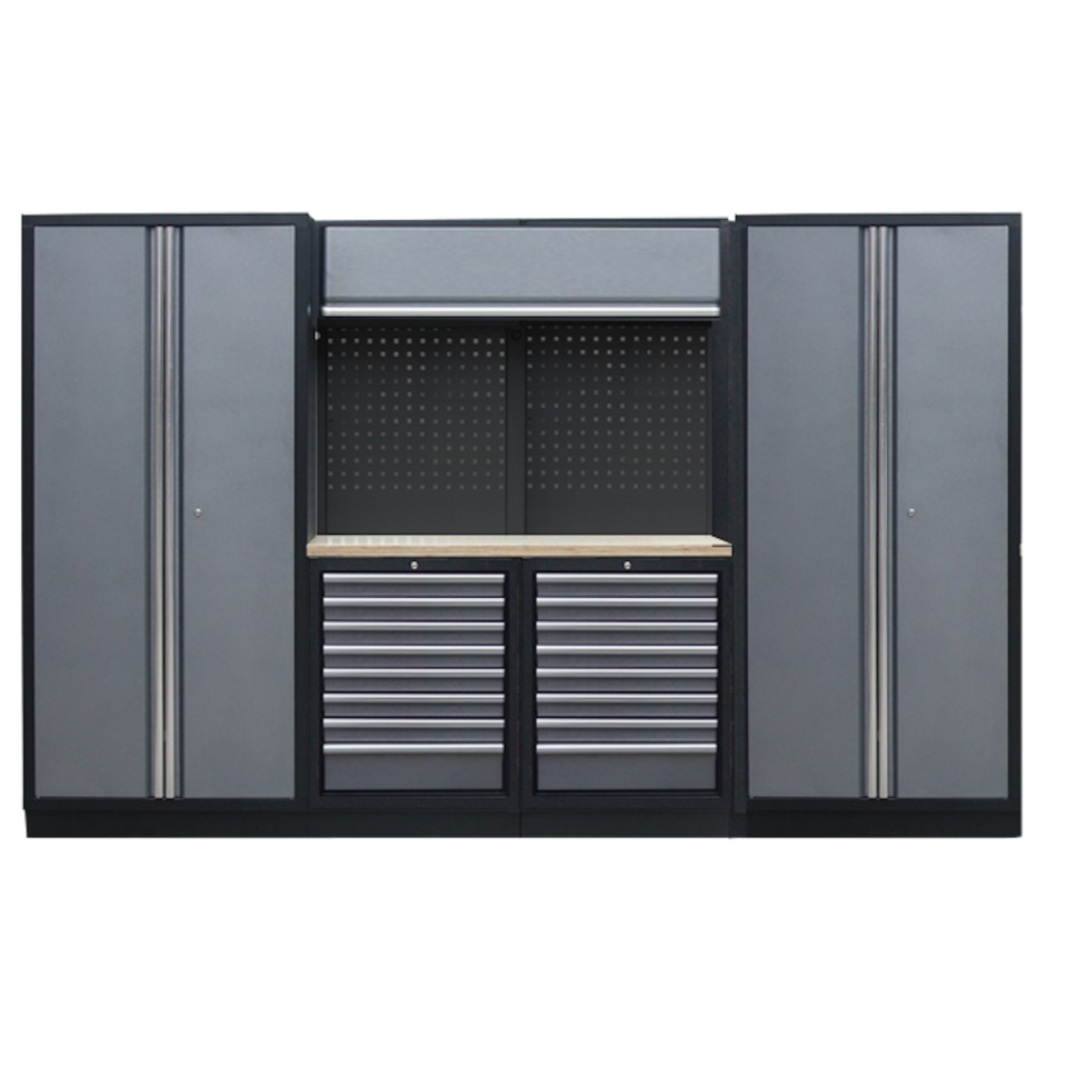 PROFESSIONELLE GARAGEN-SERIE MIT 2 RÜCKWANDPANELEN UND 2 HOHEN SCHRÄNKEN