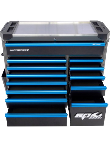 411 PC-Werkzeugkasten in der Tech-Serie Rollerkabine Diamantschwarz/Blau mit 13 Schubladen.