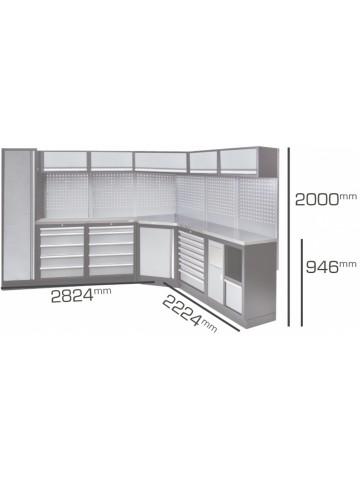 La série d'ateliers est le moyen idéal de donner à votre atelier l'aspect professionnel que vous souhaitez. Ces systèmes sont de très bonne qualité. Les systèmes peuvent être placés contre le mur ou seuls. La disposition peut être assemblée selon vos goûts et peut être fournie avec un dessus en bois de luxe ou un dessus en acier inoxydable épais.
