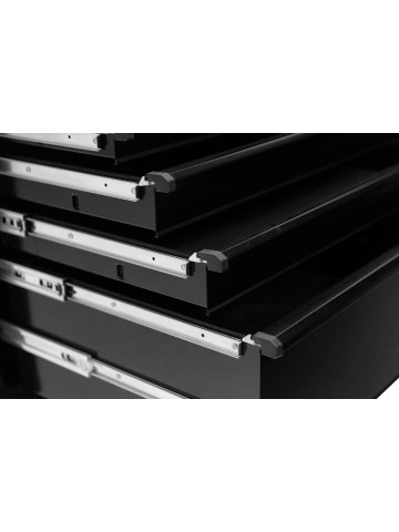 La série USA de SP Tools est l'ultime poste de travail. Avec une construction double paroi extrêmement solide en acier de 2 x 1,5 mm et une charge maximale de 400 kg sur le dessus du chariot, ce chariot à roulettes est imbattable. Les tiroirs peuvent supporter jusqu'à 120 kg chacun et disposent d'un système One Touch Click-lok et d'une fermeture douce de style cuisine, ce qui rend le travail avec eux très agréable.