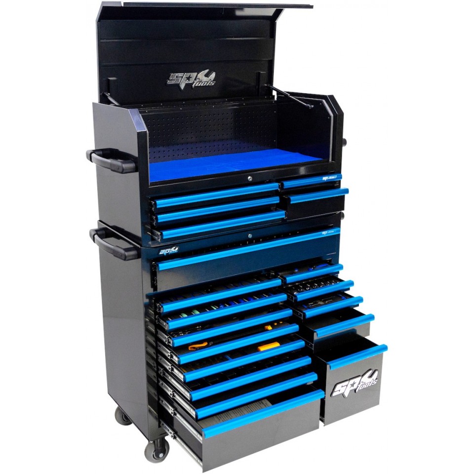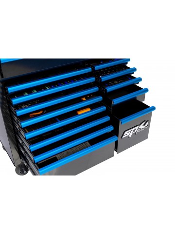 410-DELIGE GEREEDSCHAPSKOFFER IN ROLCABINE CUSTOM SERIES 14 LADEN ZWART/BLAUW + TOPKOFFER