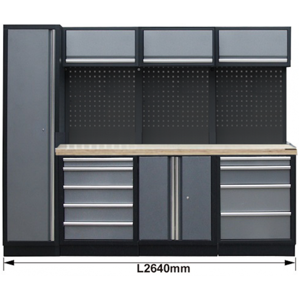 PROFESSIONEEL GARAGE WANDSYSTEEM 3 ACHTERPANELEN+ KAST MET HOUTEN WERKBLAD